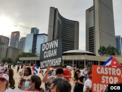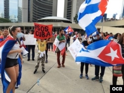 Cubanos se manifestaron este lunes frente a la sede del gobierno canadiense, en el City Hall de Toronto, en apoyo al levantamiento popular que movilizó a miles de sus compatriotas este domingo en varias ciudades de la isla.